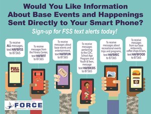 Jan. 12, 2016 Holloman FSS Introduces Text Alerts Wondering what to do this weekend? Need updates concerning the Child Development Center, or even the gym? Wish you could conveniently access base information through your cell phone? Well, the 49th Force Support Squadron has the perfect feature for you.FSS personnel created a text alert system