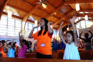 July 24, 2015 Volunteers lead children up Mt. Everest Music flooded the sanctuary already brimming with more than 100 excited children. Dancing, singing and clapping, these kids are just getting started on their day of activities prepared by volunteers.The hours of preparation these volunteers put in are finally paying off.The Holloman Chapel provides
