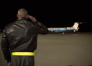 Nov. 16, 2018 Gen. Selva visits Holloman Col. Brian Patterson, 49th Wing vice commander, greets the vice chairman of the Joint Chiefs of Staff upon arrival at Holloman Air Force Base, N.M., November 13, 2018. Gen. Paul Selva, VCJCS, visited Holloman and White Sands Missile Range November 13 to 14 (U.S. Air Force photo by Staff Sgt. BreeAnn