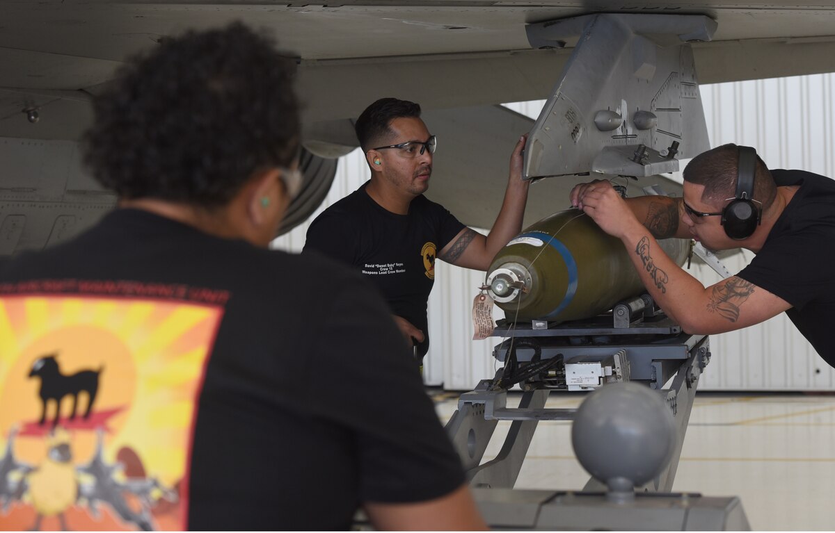 A load crew member prepares an inert bomb to be loaded on a F-16 Fighting Falcon during a quarterly load crew competition at Holloman Air Force Base, N.M., November 16, 2018. A total of five aircraft were used to test crews loading skills on F-16s and MQ-9 Reapers. (U.S. Air Force photo by Staff Sgt. Timothy Young)