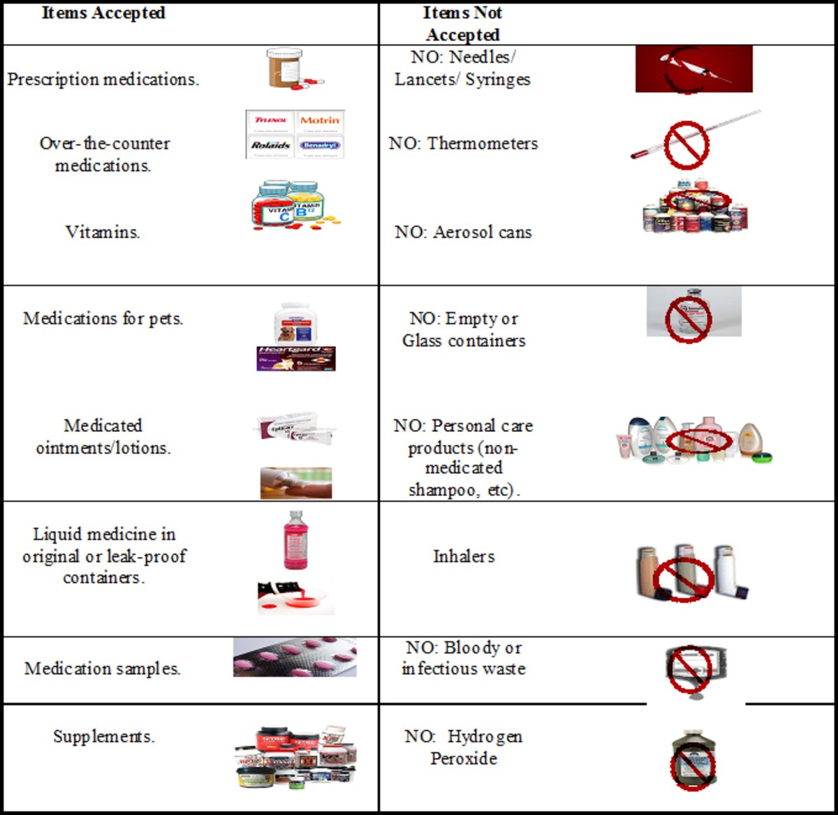Team Holloman to host another drug take back day Published April 15, 2013 49th Wing Public Affairs HOLLOMAN AIR FORCE BASE, N.M. -- Medicines that languish in home cabinets are highly susceptible to diversion, misuse and abuse. The number of accidental poisonings and overdoses due to these drugs is remarkably high and on the rise. To address this public safety issue, on April 27 from 10 a.m. to 2 p.m. the 49th Security Forces Squadron, 49th Medical Group pharmacy and the Drug Demand Reduction Office will team up with the Drug Enforcement Administration to prevent drug abuse and theft by collecting dangerous, expired, unused, and unwanted prescription and non-prescription drugs. During this time, patients may bring old, expired, unused and unwanted medications to the Holloman AFB Exchange, or Shoppette for disposal. The service is free and anonymous no questions asked. Every six months TSgt Akamie Fives, 49th Medical Support Squadron diagnostic and therapeutics flight chief, and Mr. Charles Hawkins, 49th Security Forces Squadron, Installation Resource Protection Program Manager, assist the Drug Enforcement Agency in collecting unused, expired drugs. The DEA then disposes of the drugs via incineration. This effort was started in Sept. 2010 and this collection on April 27 from 10 a.m. to 2 p.m. hrs will be only the sixth collection effort. The first five efforts have removed over 2 million pounds (1038 tons) of medication from circulation. Please contact Mr. Charles Hawkins at 572-0196 or TSgt Akamie Fives @ 572-2778 with any concerns. Items Accepted Prescription medications Medication samples Over-the-counter medications Vitamins, supplements Medications for pets Medicated ointments/lotions Inhalers Liquid medicine in glass or leak-proof containers Items Not Accepted Needles/ Lancets/ Syringes Thermometers Aerosol cans Empty containers Personal care products (non-medicated shampoo, etc). Bloody or infectious waste Hydrogen Peroxide