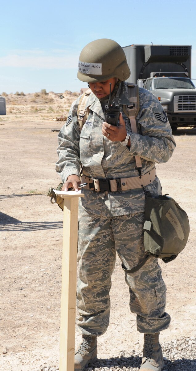 Master Sgt. Jimmy Green, 49th Medical Support Squadron, is evaluated by an Exercise Evaluation Team member after a simulated aircraft attack during the Phase II exercise at Holloman Air Force Base, N.M. After finding a simulated unexploded ordinance, Sergeant Green uses his Airman?s Manual to ensure he follows the correct safety procedures. He later formed a human cordon around the UXO to make certain no one crossed its path. (U.S. Air Force photo/Airman 1st Class Sondra M. Escutia)