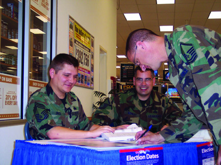 Chief Master Sgt. William Urick and Master Sgt . Paul Schiley, both 46th Test Group unit voting assitance officers, help Master Sgt. Joel Jones, 49th Civil Engineer Squadron, register to vote. For more information of registering to vote, contact your UVAO or go to www.fvap.gov
