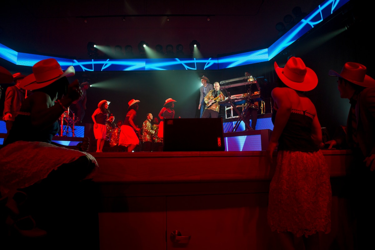 Master Sgt. Justin Worley, 744th Communications Squadron cyber transport craftsman, plays a guitar solo during the Tops in Blue performance at Tays Center, Alamogordo, N.M., May 31. Tops in Blue is comprised of vocalists, musicians, dancers and technicians serving in the U.S. Air Force. The group’s primary mission is to perform for military personnel and their families throughout the world. (U.S. Air Force photo by Airman 1st Class Aaron Montoya / Released)