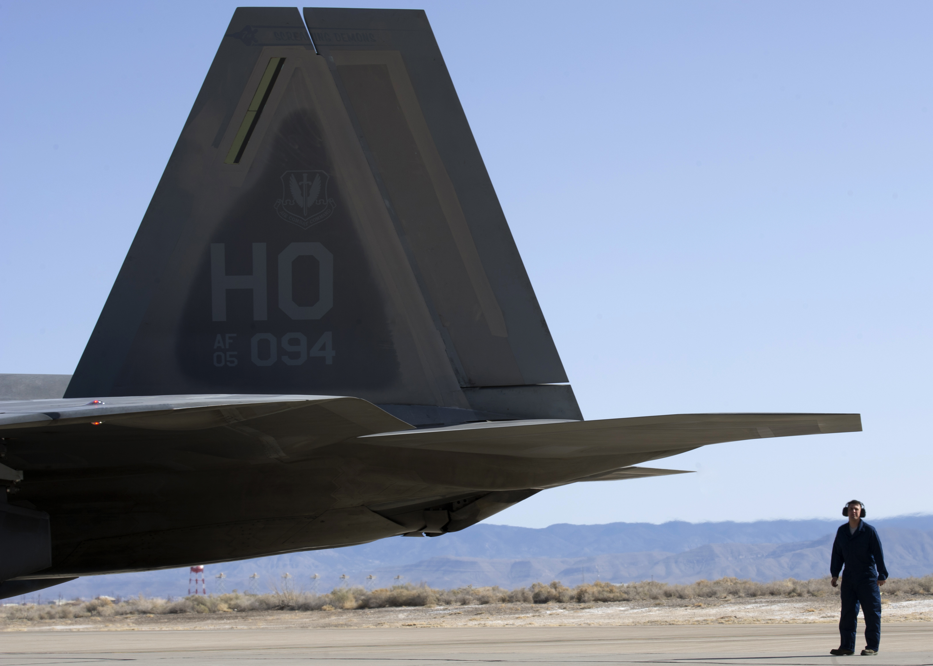 HOLLOMAN AIR FORCE BASE, N.M. – Senior Airman Mark Martinez inspects an F-22 Raptor prior to takeoff during a Phase One Operational Readiness Exercise Feb. 29. Martinez is a 7th Aircraft Maintenance Unit crew chief, and the F-22 is assigned to the 7th Fighter Squadron. The exercise is designed to test the wing’s ability and readiness to deploy assets. (U.S. Air Force photo by Senior Airman Kasey Close/Released)