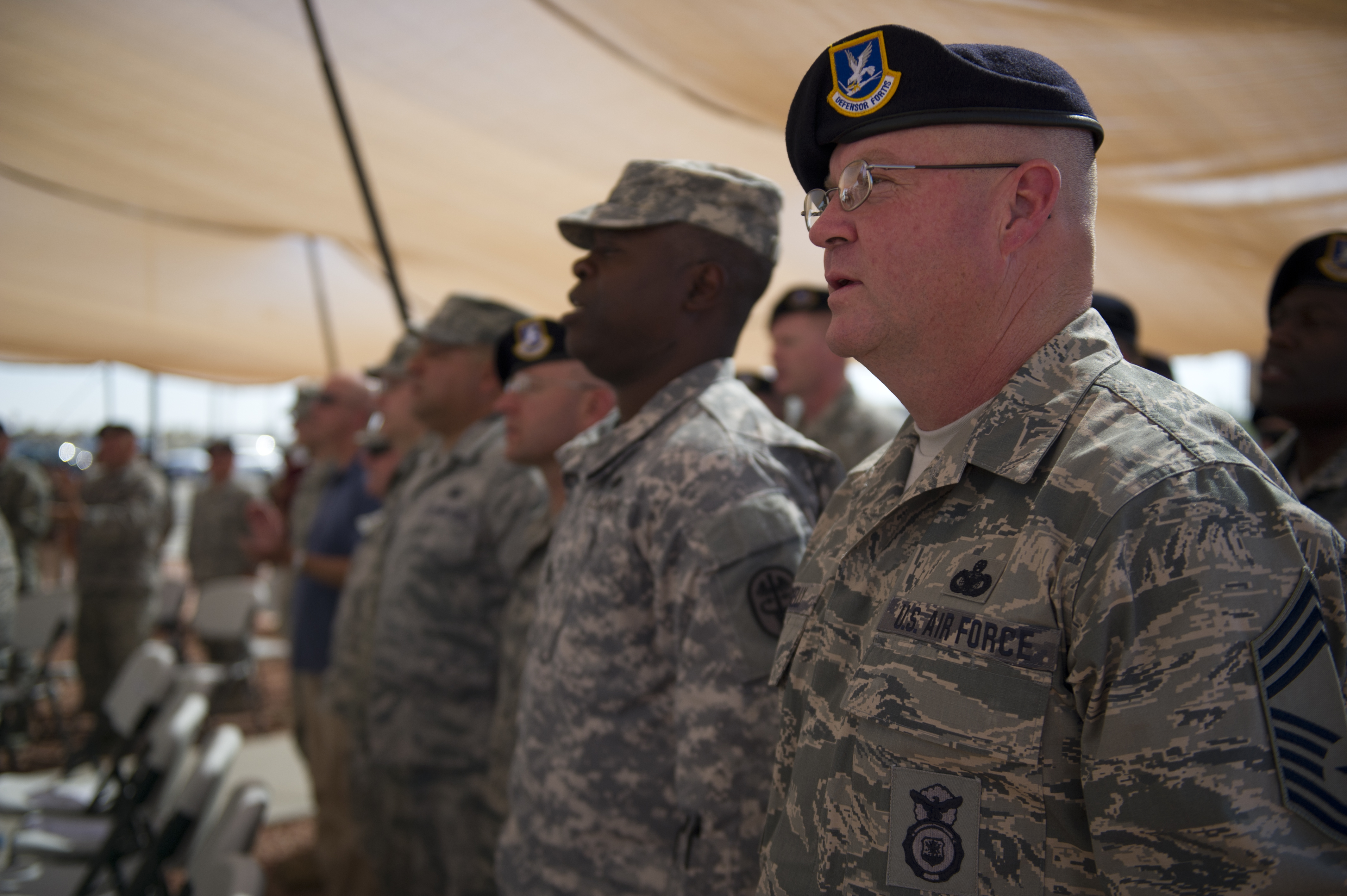 Military Police personnel from both the Air Force and Army sing the Air Force song during the opening ceremony of the Ground Command Readiness Training Center assumption of command at Fort Bliss, Texas, June 26. The GCRTC consolidated a regional training center for all the military police personnel from both Air Force and Army to use to conduct required pre-deployment training. (U.S. Air Force photo by Airman 1st Class Aaron Montoya / Released)