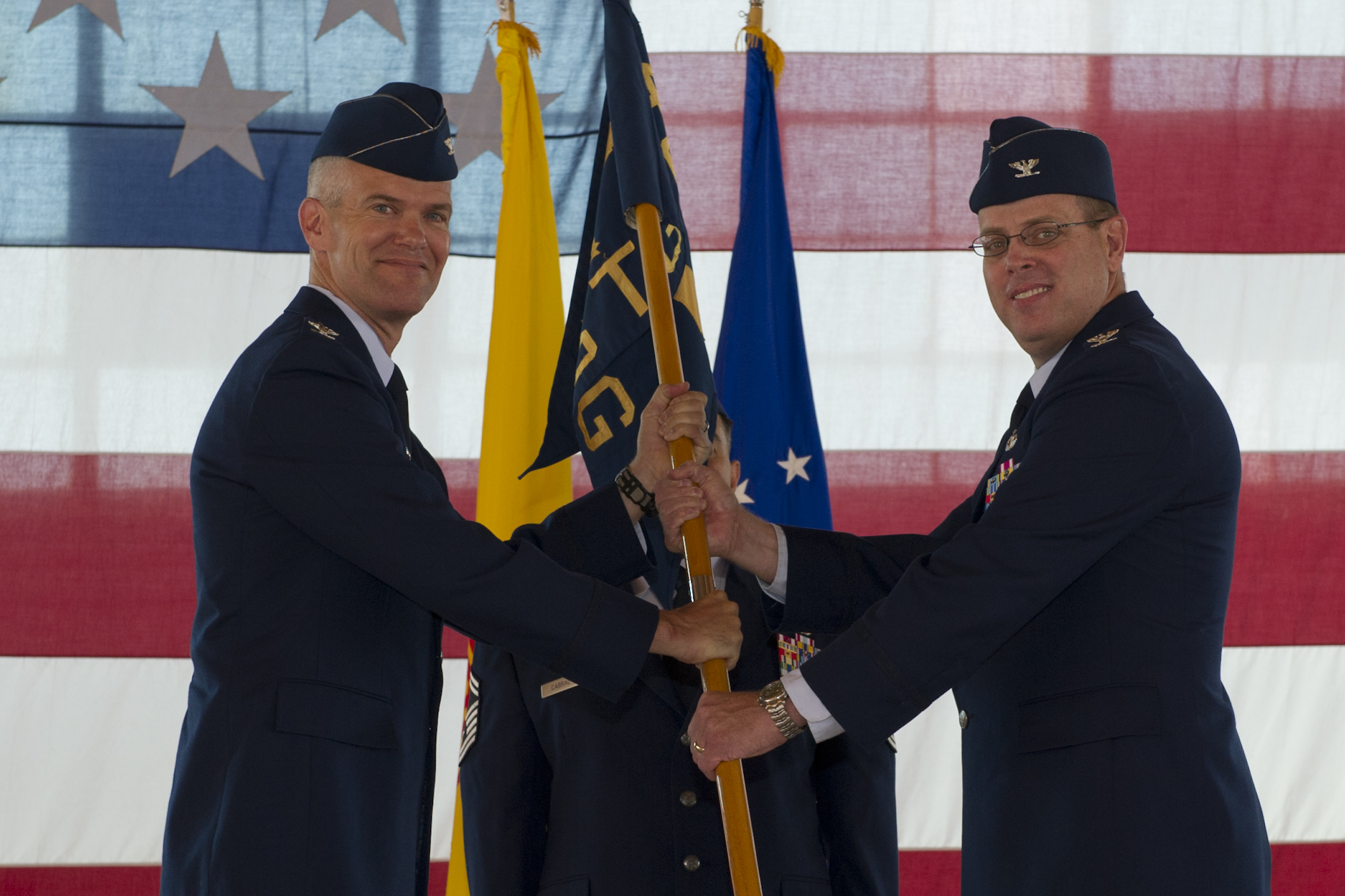 Colonel Raymond Toth (center), outgoing 46th Test Group commander, relinquishes command of the 46th TG to Col. Colin Miller, 46th Test Wing commander at Eglin Air Force Base, Fla., during the 46th TG change of command ceremony at Holloman Air Force Base, N.M., June 28. Before relinquishing command of the group, Toth was awarded the Legion of Merit Medal for his and the 46th TG’s accomplishments during his tenure as commander. Miller attended the ceremony to officiate the transfer of command of the 46th TG to incoming 46th TG commander, Col. Charles Webb. (U.S. Air Force photo by Senior Airman Siuta B. Ika/Released)