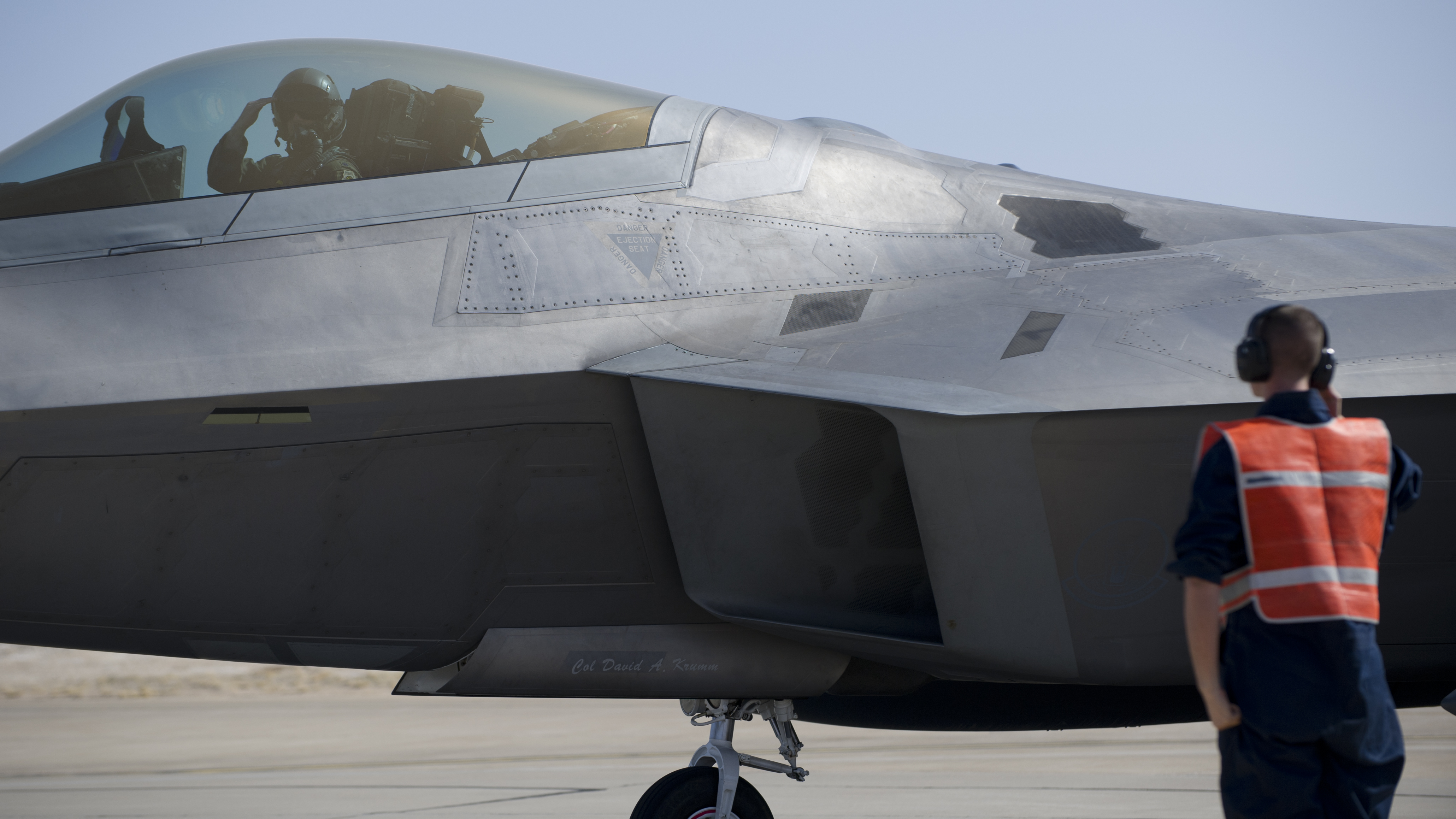 HOLLOMAN AIR FORCE BASE, N.M. – A 7th Fighter Squadron pilot returns a salute to Senior Airman Simon Zemanek, a crew chief from the 7th Aircraft Maintenance Unit, during a Phase One Operational Readiness Exercise Feb. 29. Holloman performs large-scale exercises to ensure its Airmen are ready at a moment’s notice for real-world situations. (U.S. Air Force photo by Airman 1st Class Michael Shoemaker/Released)