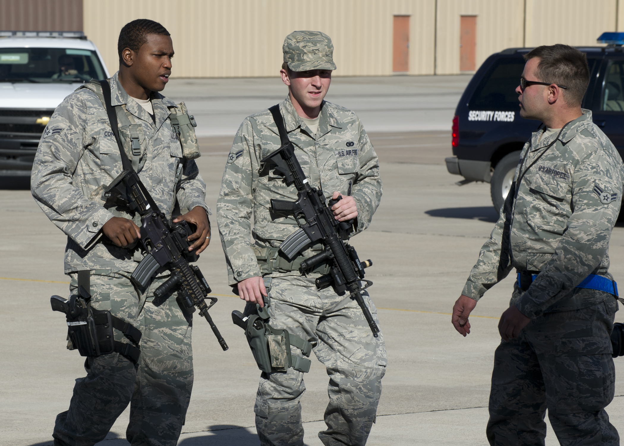 HOLLOMAN AIR FORCE BASE, N.M. – U.S. Air Force Airman 1st Class Mark Constantine and U.S. Air Force Airman 1st Class Nicholas Dent, both with the 49th Security Forces Squadron, arrive on scene after being notified of an intruder on the flightline here Feb. 28. The security forces standards and evaluations Team performed a flightline intrusion exercise to test the readiness of Airmen on the flightline to react to intruders. (U.S. Air Force photo by Airman 1st Class Daniel E. Liddicoet/Released)