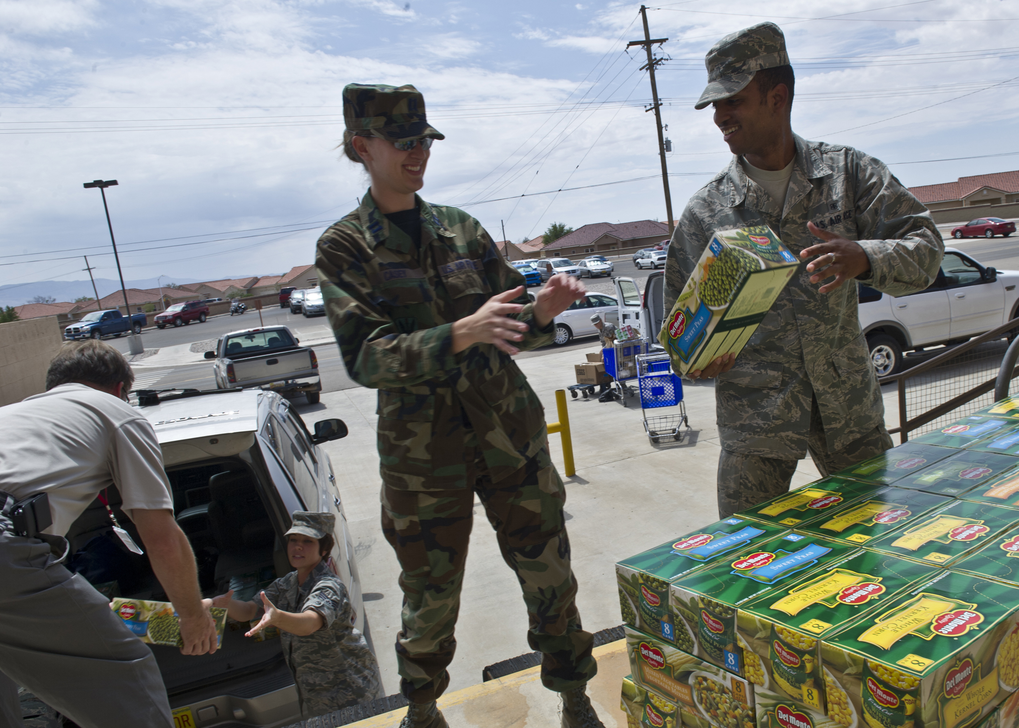 HOLLOMAN AIR FORCE BASE, N.M. -- Members of Team Holloman work together to load food donated by the Commissary Aug. 11, 2011, in the loading zone of the store. A total of 3,865 pounds of donated food went to Love In the Name of Christ, a local non-profit food bank that helps the community in need. Holloman has totaled 9,291 pounds to various organizations this month. (U.S. Air Force photo by Airman 1st Class Eileen Meier/Released)