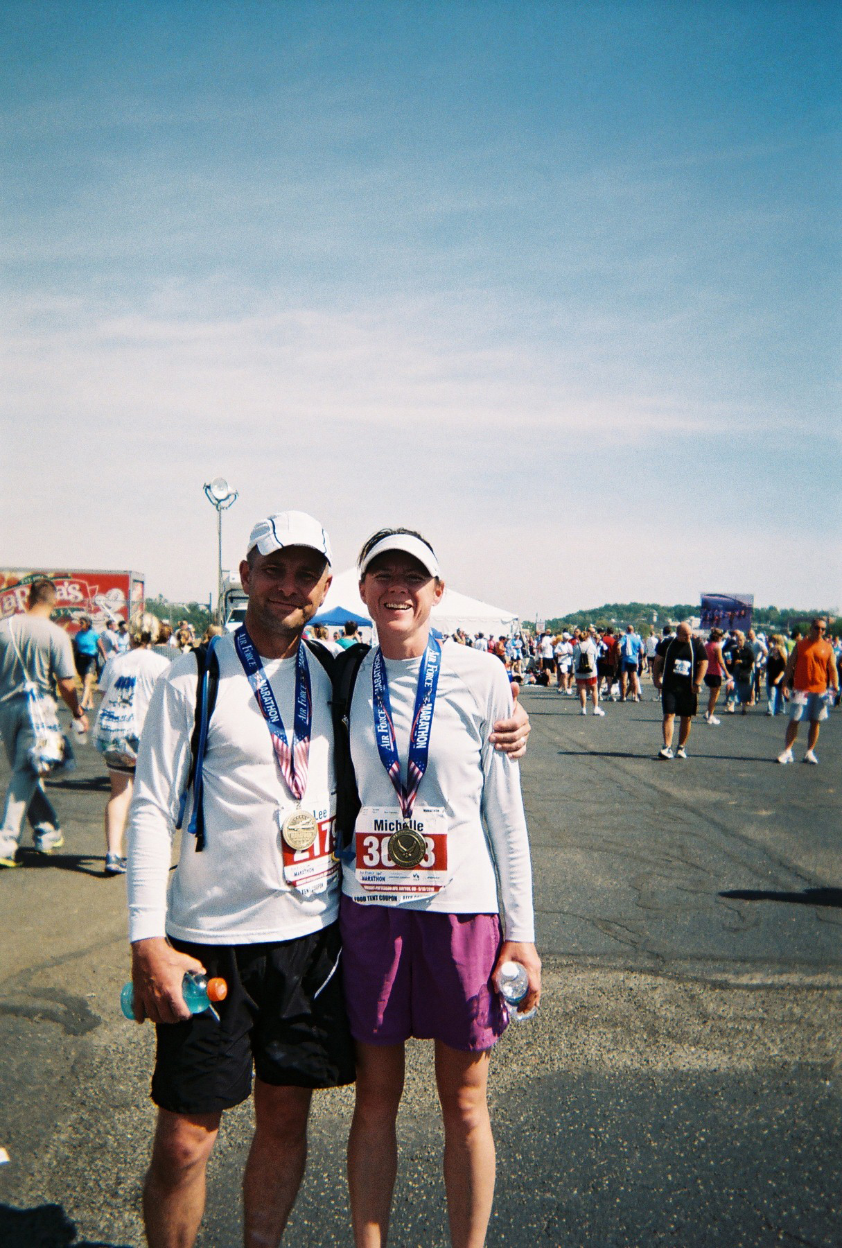 WRIGHT PATTERSON AIR FORCE BASE, Ohio -- Lee Powell and Michelle Ziesset, representing the 746th Test Squadron at Holloman AFB, N.M., participated in the 14th Annual Air Force Marathon Sept. 18. Both finished in 4:19:35. A record field of 12,000 runners registered for 2010 Air Force Marathon events Sept. 17 - 18, which included wheeled division, a half-marathon, 10K and 5K runs. (Courtesy photo / Released)