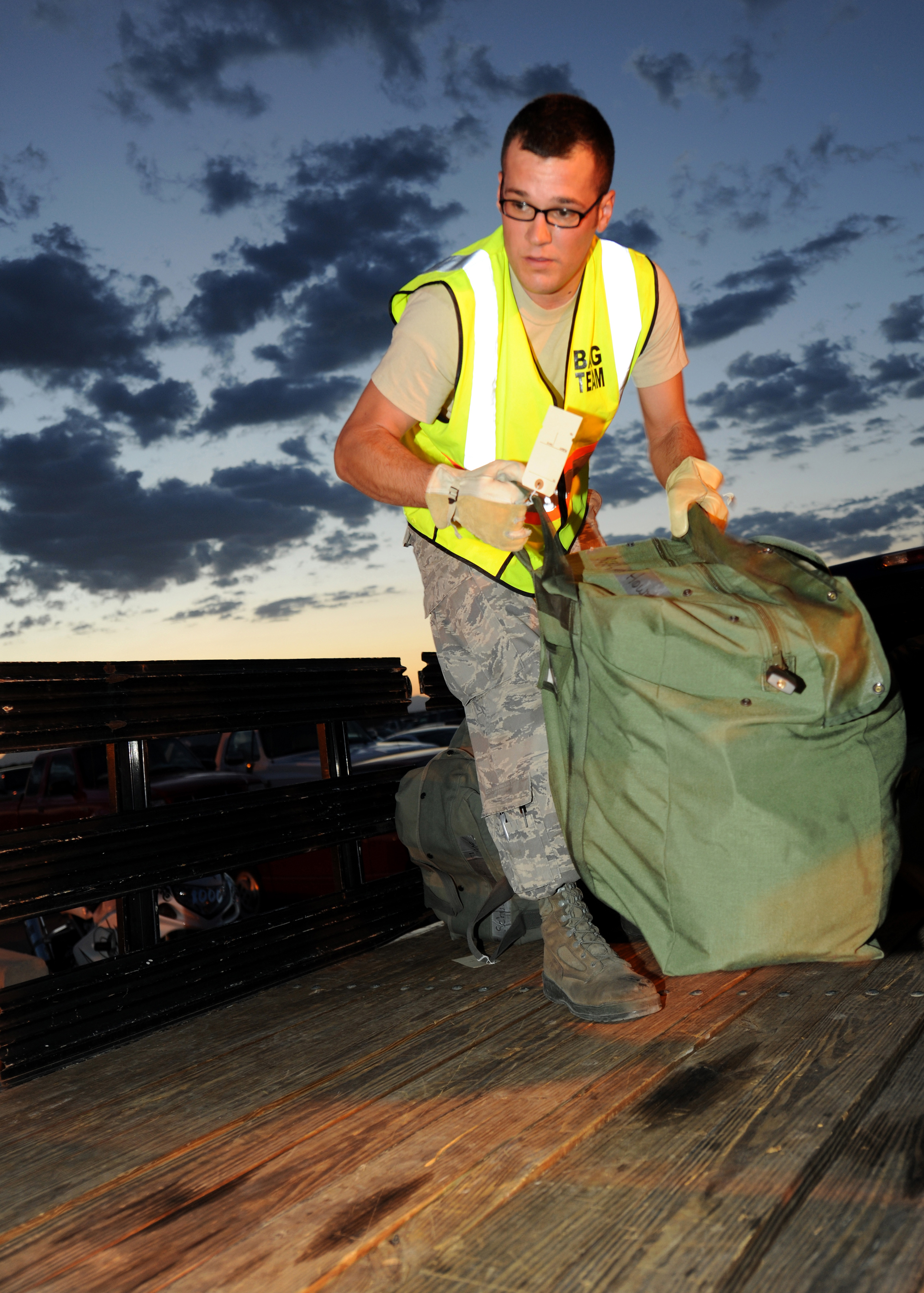 HOLLOMAN AIR FORCE BASE, N.M. -- Airman 1st Class Jason Zimmerman, 49th Logistics Readiness Squadron, unloads mobility bags to be palletized and processed along with approximately 400 Airmen during a Phase I exercise April 14, 2010. During a Phase I, Team Holloman tests their ability to deploy and support national security objectives all over the world at a moment's notice. (U.S. Air Force photo by Senior Airman Michael Means / Released)