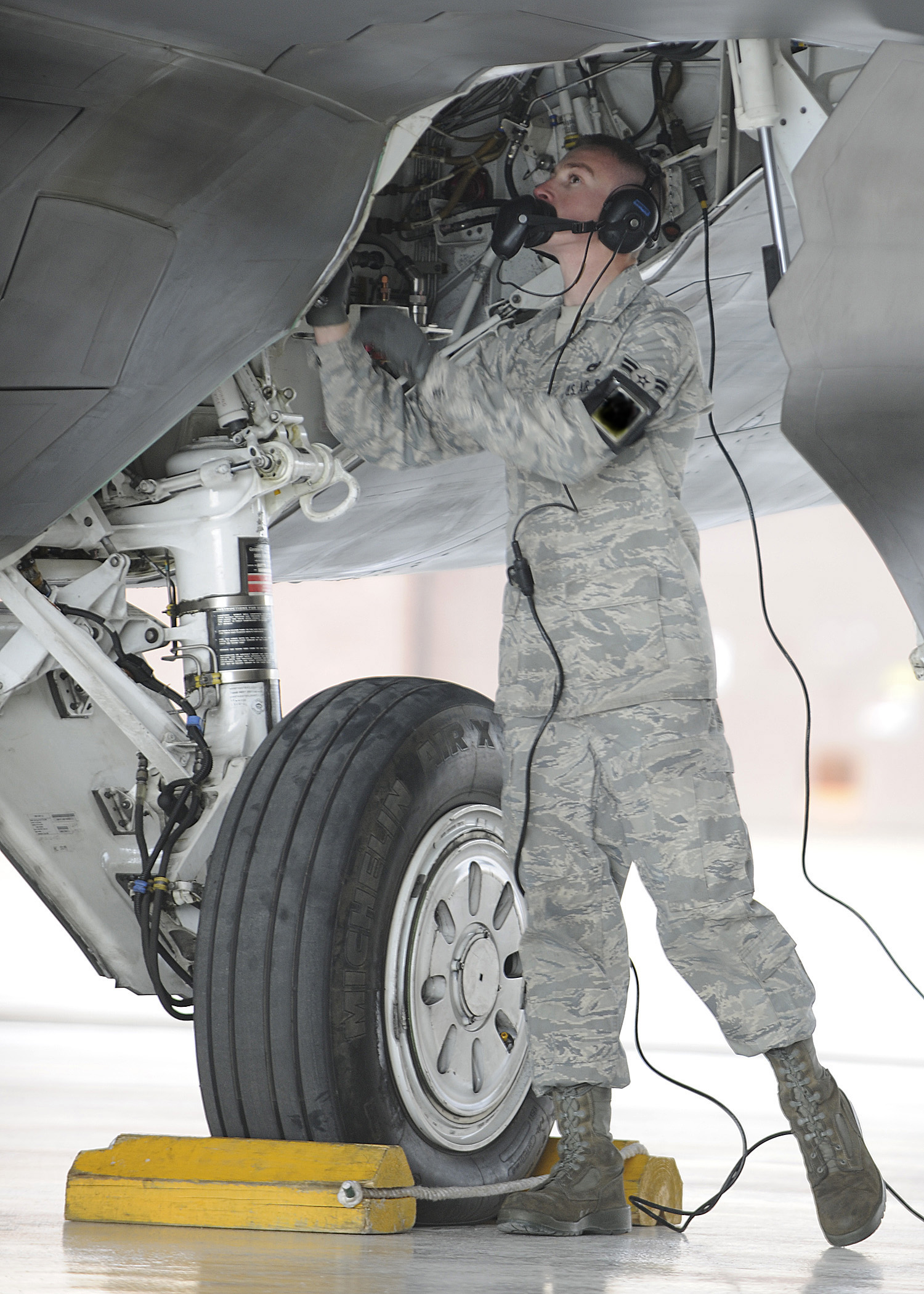 HOLLOMAN AIR FORCE BASE, N.M. -- Airman 1st Class Robert Miller, 49th Aircraft Maintenance Squadron, prepares an F-22 Raptor to take off for Red Flag, Jan. 23. The Red Flag exercise is conducted on the 15,000-square-mile Nevada Test and Training Range, north of Las Vegas. (U.S. Air Force photo by Senior Airman John D. Strong II)