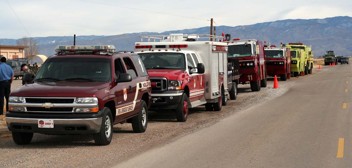 Holloman first responders line up ready to convoy out to the landing site should the shuttle Discovery land in New Mexico. The shuttle has only landed in New Mexico once, in 1982. (U.S. Air Force photo by Airman 1st Class Heather Stanton)
