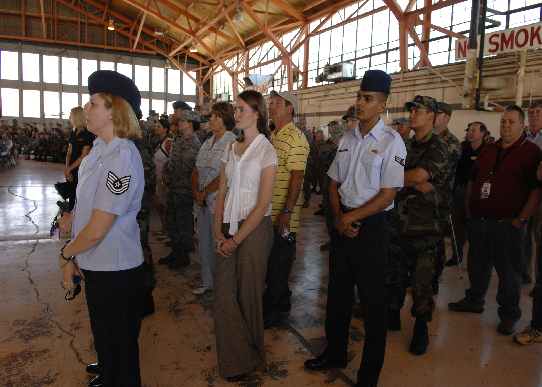 Members of Team Holloman look on during the F-22A Arrival Ceremony in Hangar 500 on Holloman Air Force Base, N.M., June 6. The ceremony was part of a weeklong celebration for the arrival of the first two F-22A Raptors to arrive on Holloman. (U.S. Air Force photo/Airman 1st Class Rachel A. Kocin)