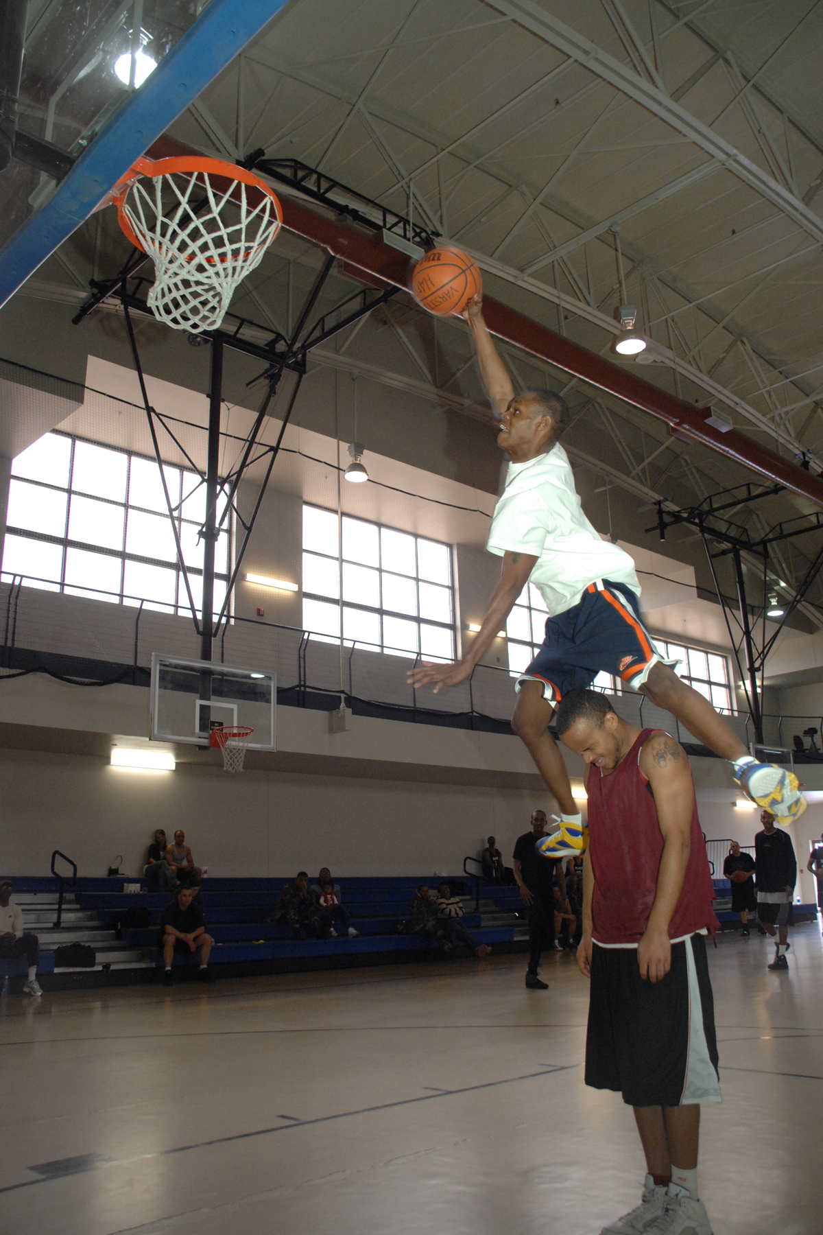 Airman 1st Class Jarad Hudgies Jr., 49th Mission Support Squadron, leaps over Jason Lair during a slam dunk contest Feb. 15, 2008, at Holloman Air Force Base, N.M. Airman Hudgies won the slam dunk contest, awarding himself a traveling sports bag. (U.S. Air Force photo/Airman 1st Class Jamal D. Sutter)