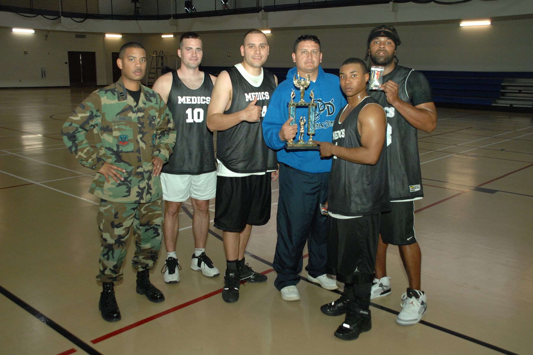 Members of MLK accept the first place trophy after defeating the Rude Boys during a 3 on 3 basketball tournament Feb. 15, 2008, at Holloman Air Force Base, N.M. The event brought together members of Team Holloman to raise awareness and celebrate the many contributions African-Americans made to our nation. (U.S. Air Force photo/Airman 1st Class Jamal D. Sutter)