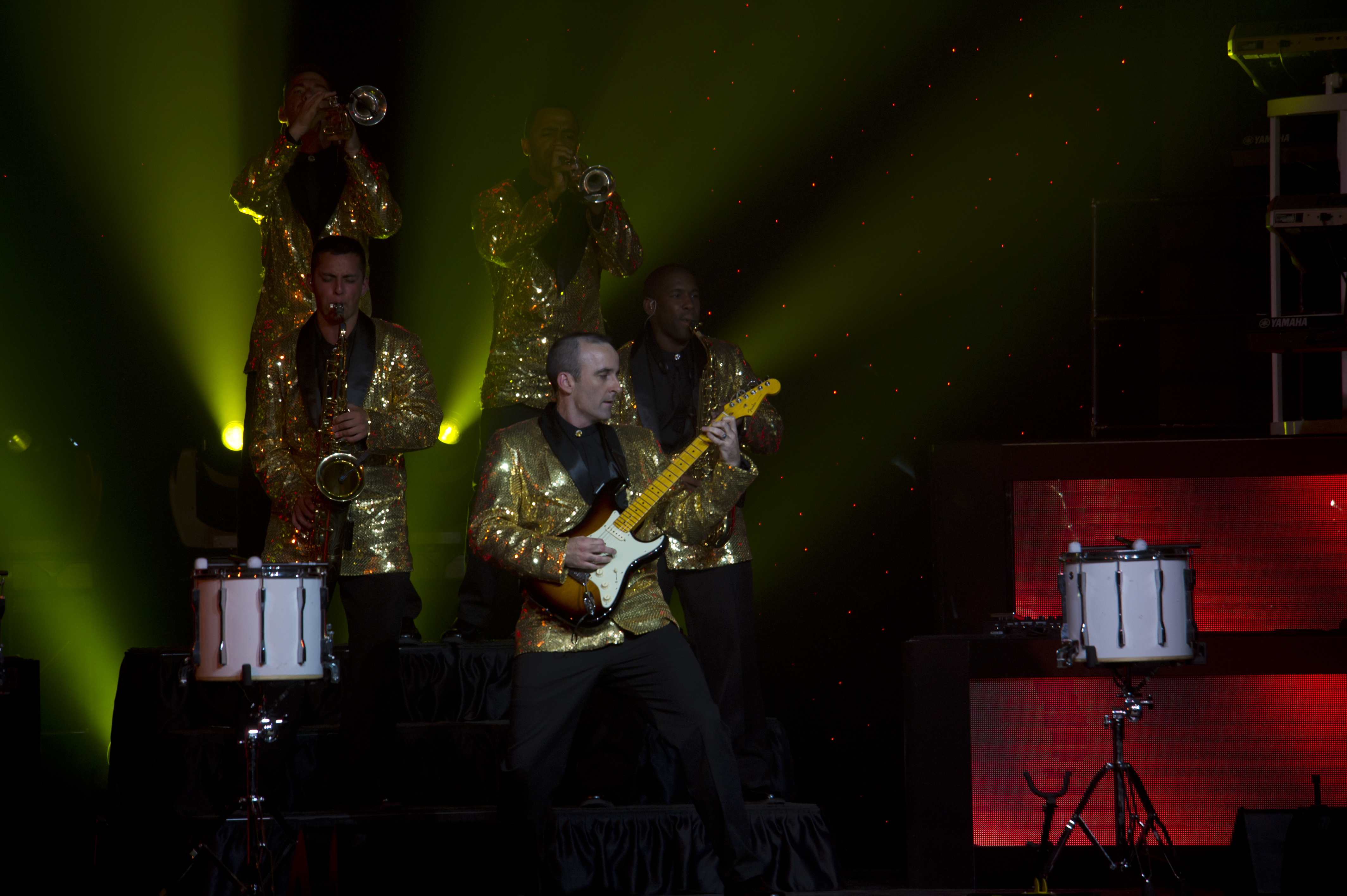 Master Sgt. Justin Worley, 744th Communications Squadron cyber transport craftsman, plays a guitar solo during the Tops in Blue performance at Tays Center, Alamogordo, N.M., May 31. Tops in Blue is comprised of vocalists, musicians, dancers and technicians serving in the U.S. Air Force. The group’s primary mission is to perform for military personnel and their families throughout the world. (U.S. Air Force photo by Airman 1st Class Aaron Montoya / Released)