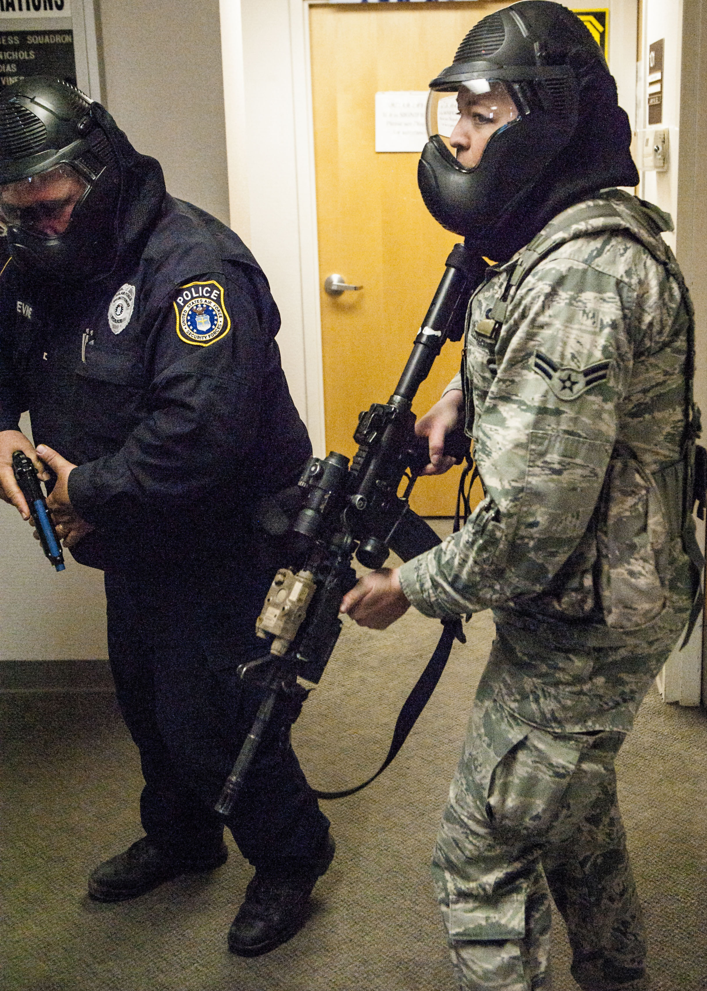 Members of the 49th Security Forces Squadron clear a building during an active shooter exercise April 30, 2015 at Holloman Air Force Base, N.M. Multiple times per year, Holloman hosts active shooter exercises to test procedures and maintain readiness in case of a real-world emergency. (U.S. Air Force photo by Airman 1st Class Emily A. Kenney/Released)