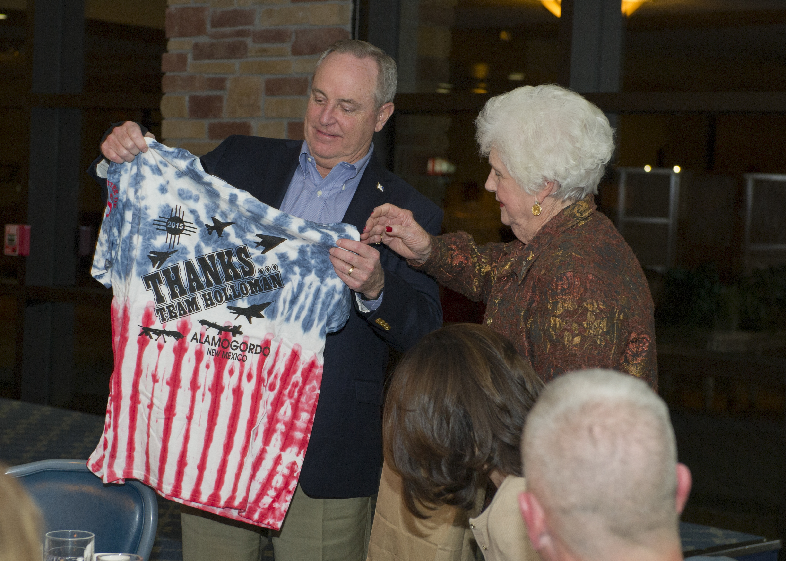 Air Force Chief of Staff Gen. Mark A. Welsh lll receives a gift from Toots Green, a Holloman Wingman, to thank him for taking the time to visit Holloman Air Force Base, New Mexico on Nov. 16th. Welsh accepted the gift as part of a civic leader dinner to get to know the leaders of the community and learn how their support helps Team Holloman and its mission every day. He also had the opportunity to tour Holloman and review Air Force needs, requirements and investments with a sustained focus on successes and challenges Airmen face today. Welsh was joined by his wife, Betty Welsh, who addressed top Air Force issues such as suicide prevention, resiliency, exceptional family member programs and sexual assault. (U.S. Air Force photo by Senior Airman Leah Ferrante)
