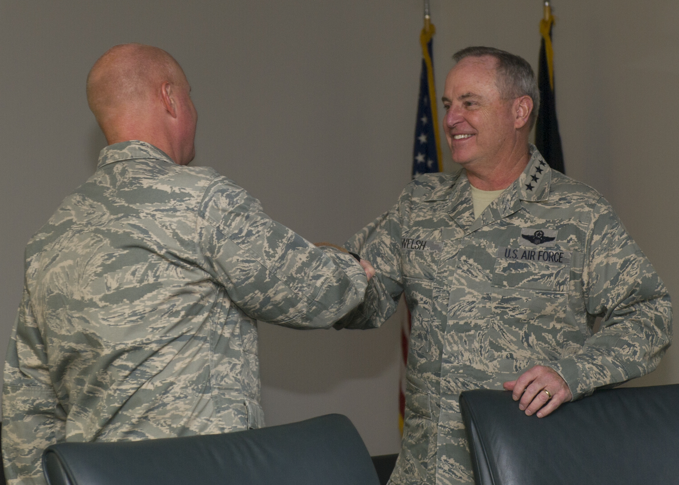 Air Force Chief of Staff Gen. Mark A. Welsh lll greets Col. Joseph Moehlmann, the 49th Materiel Maintenance Group commander, during his visit to Holloman Air Force Base, New Mexico on Nov. 16. During his visit, members of Team Holloman provided tours and briefings highlighting the unique missions Holloman sustains every day. Welsh also had the opportunity to review Air Force needs, requirements and investments with a sustained focus on successes and challenges Airmen face today. Welsh was joined by his wife, Betty Welsh, who addressed top Air Force issues such as suicide prevention, resiliency, exceptional family member programs and sexual assault. (U.S. Air Force photo by Senior Airman Leah Ferrante)