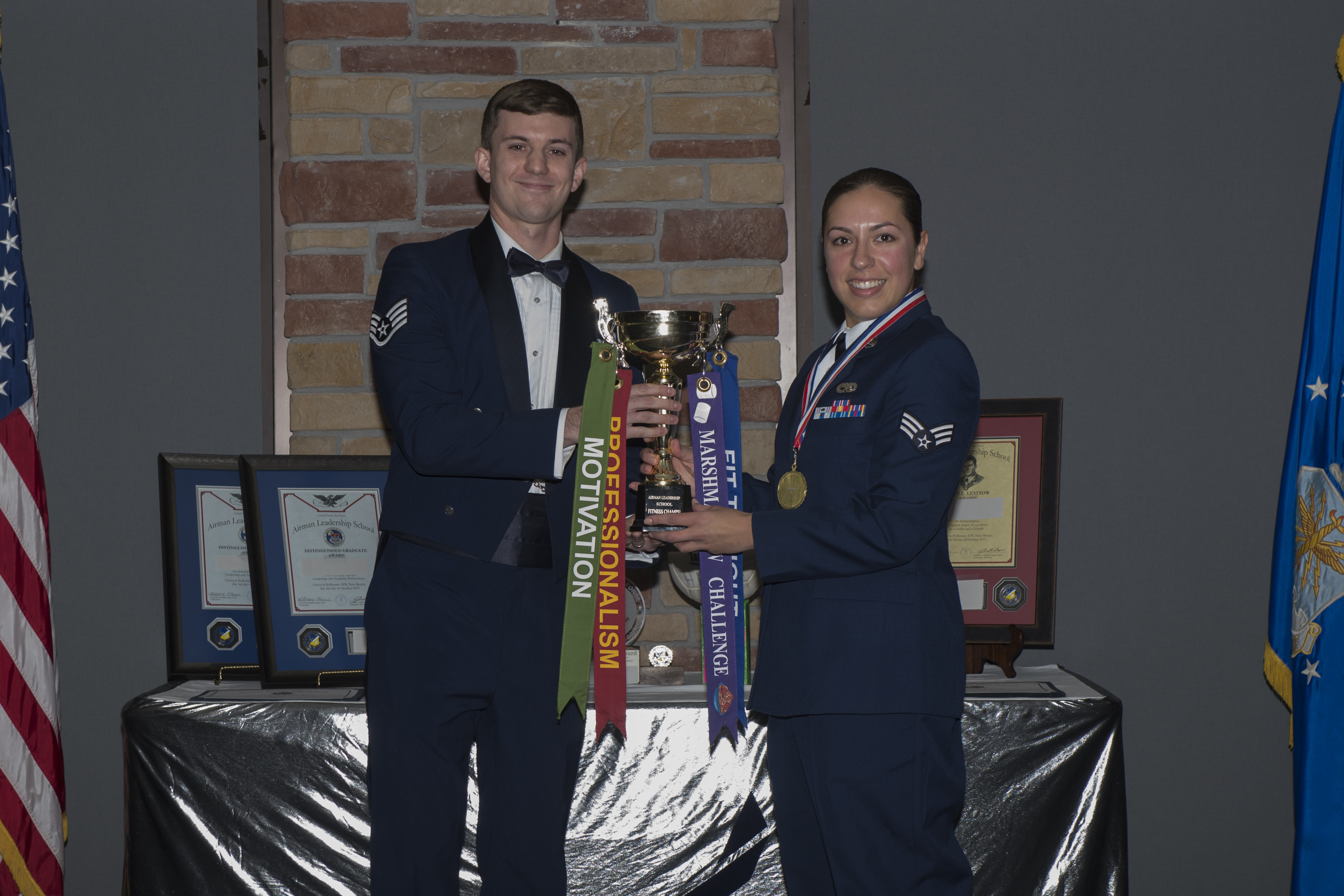 Senior Airman Travis Coursey, Airman Leadership School graduate, accepts the distinguished graduate award during the graduation of ALS class 19-7, October 10, 2019, on Holloman Air Force Base, N.M. The distinguished graduate award is presented to the top ten-percent of graduates for their performance in academic evaluations and demonstration of leadership. (U.S. Air Force photo by Airman 1st Class Kristin Weathersby)