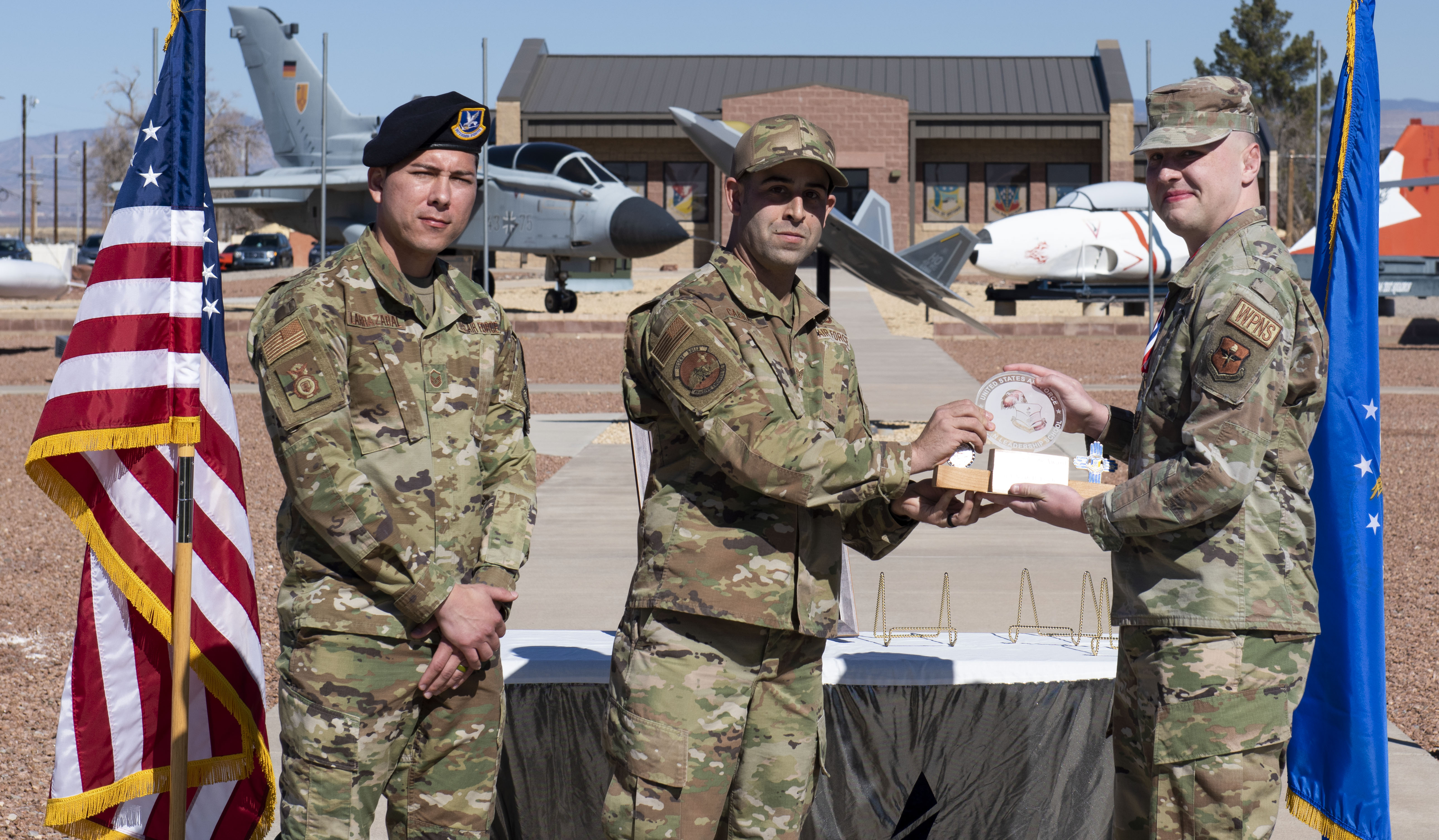 Senior Airman Noah Fischer, Airman Leadership School graduate, accepts the commandant leadership award during the graduation of ALS class 22-3, Feb. 10, 2022, on Holloman Air Force Base, New Mexico. The commandant leadership award is selected by the ALS commandant and is presented to the student who demonstrates exemplary leadership characteristics. (U.S. Air Force photo by Senior Airman Quion Lowe)